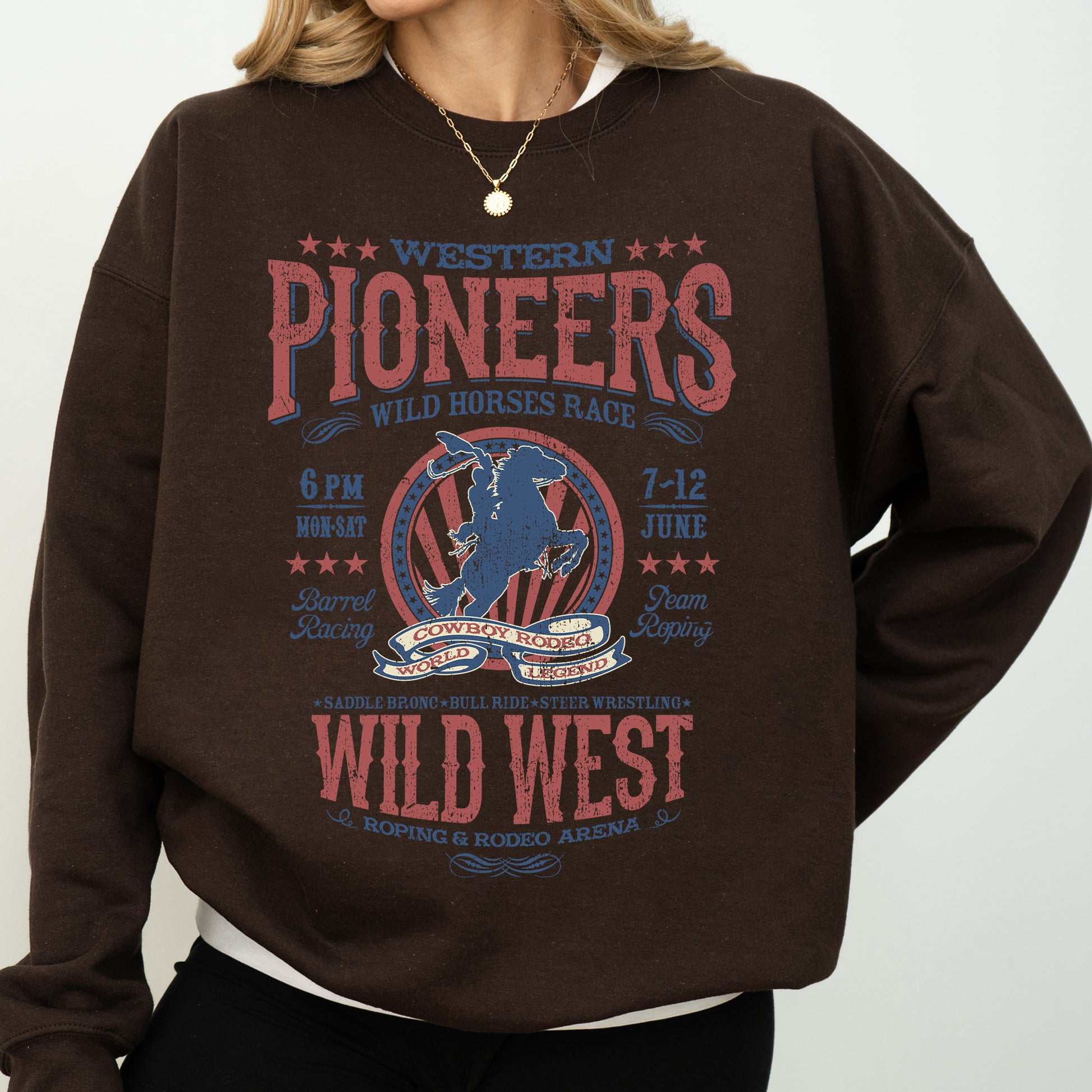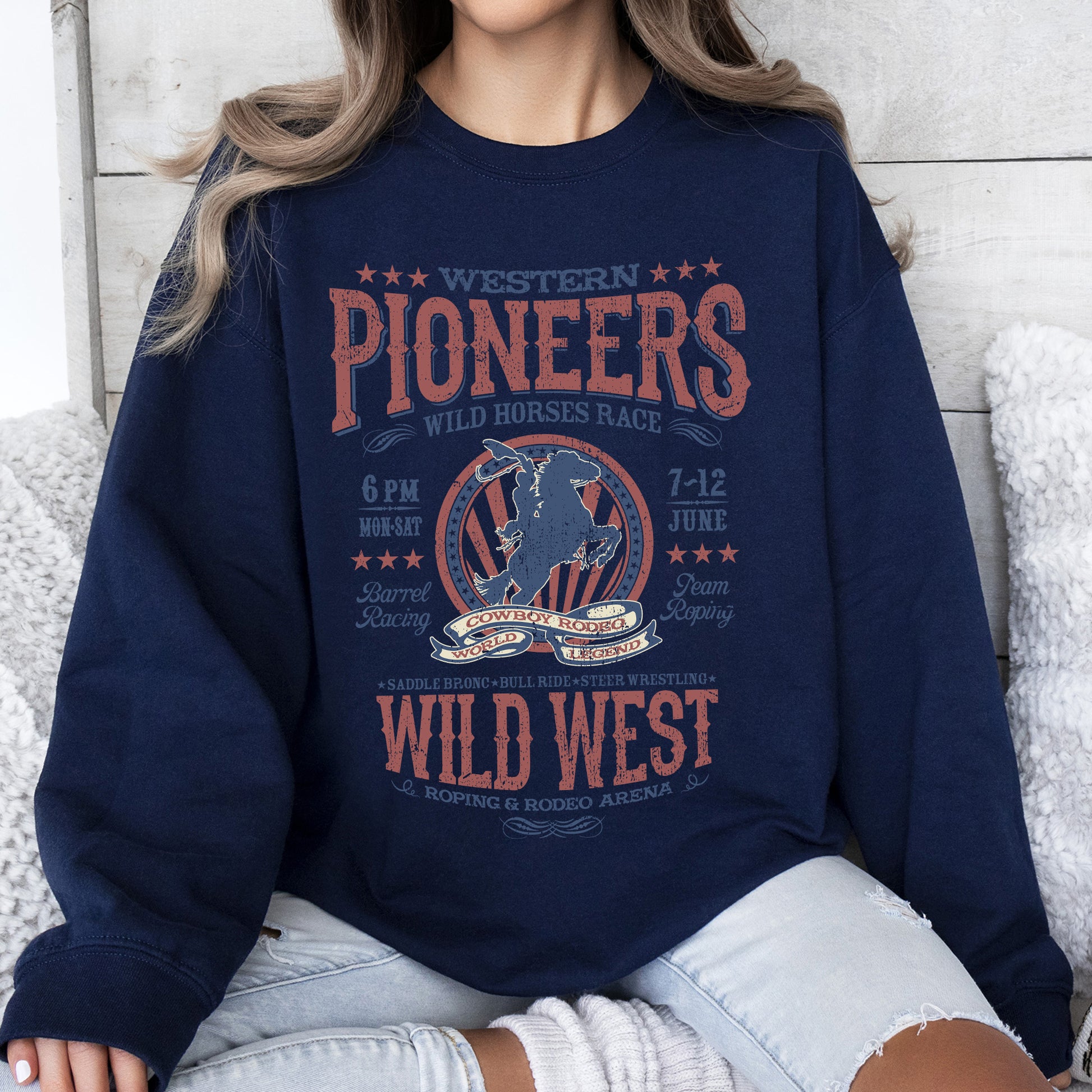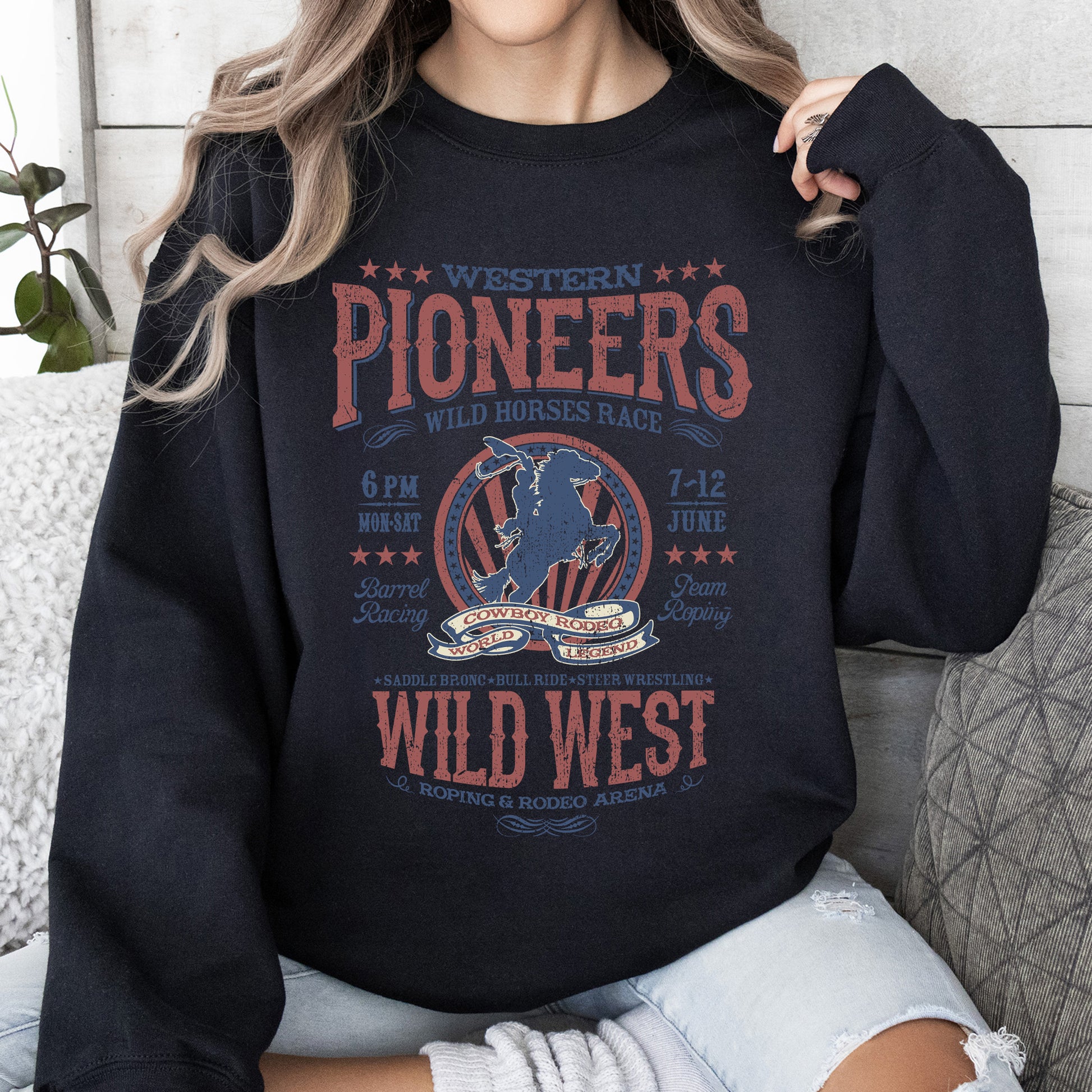 This Bronco Riding, Wild Horse Race, Cowboy, Cowgirl Sweatshirt pairs beautifully with your favorite jeans for a laid-back look or can be layered over shirts for added flair. Perfect for casual outings, rodeo events, or cozy nights in, this sweatshirt is more than just clothing; it's a statement of your adventurous spirit!