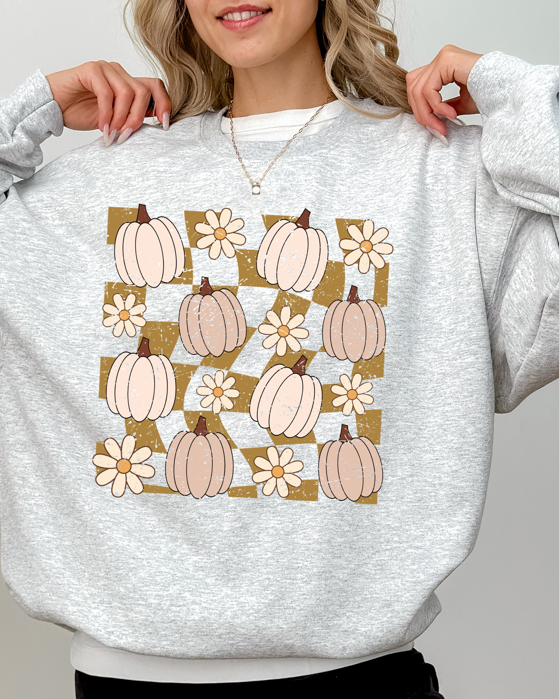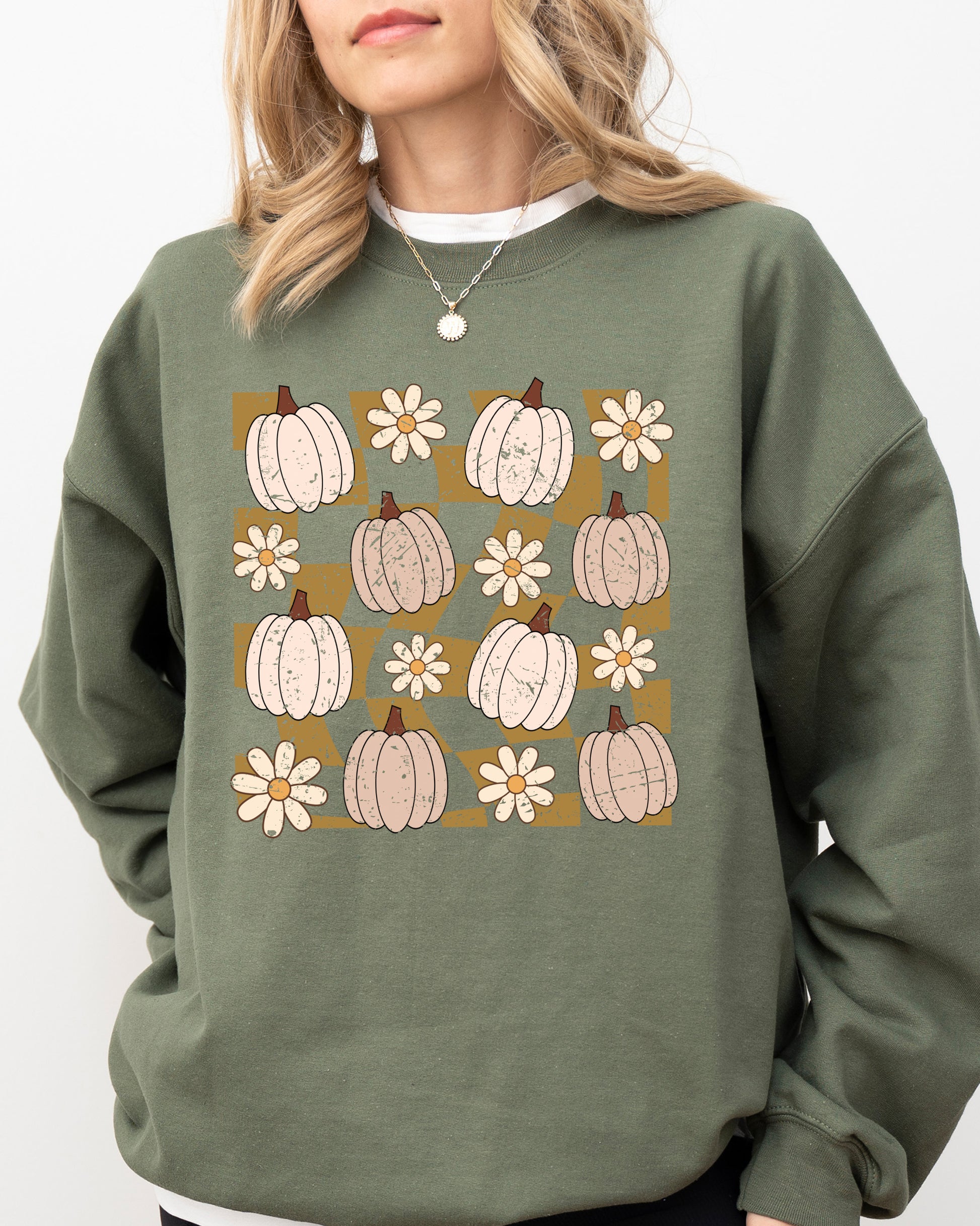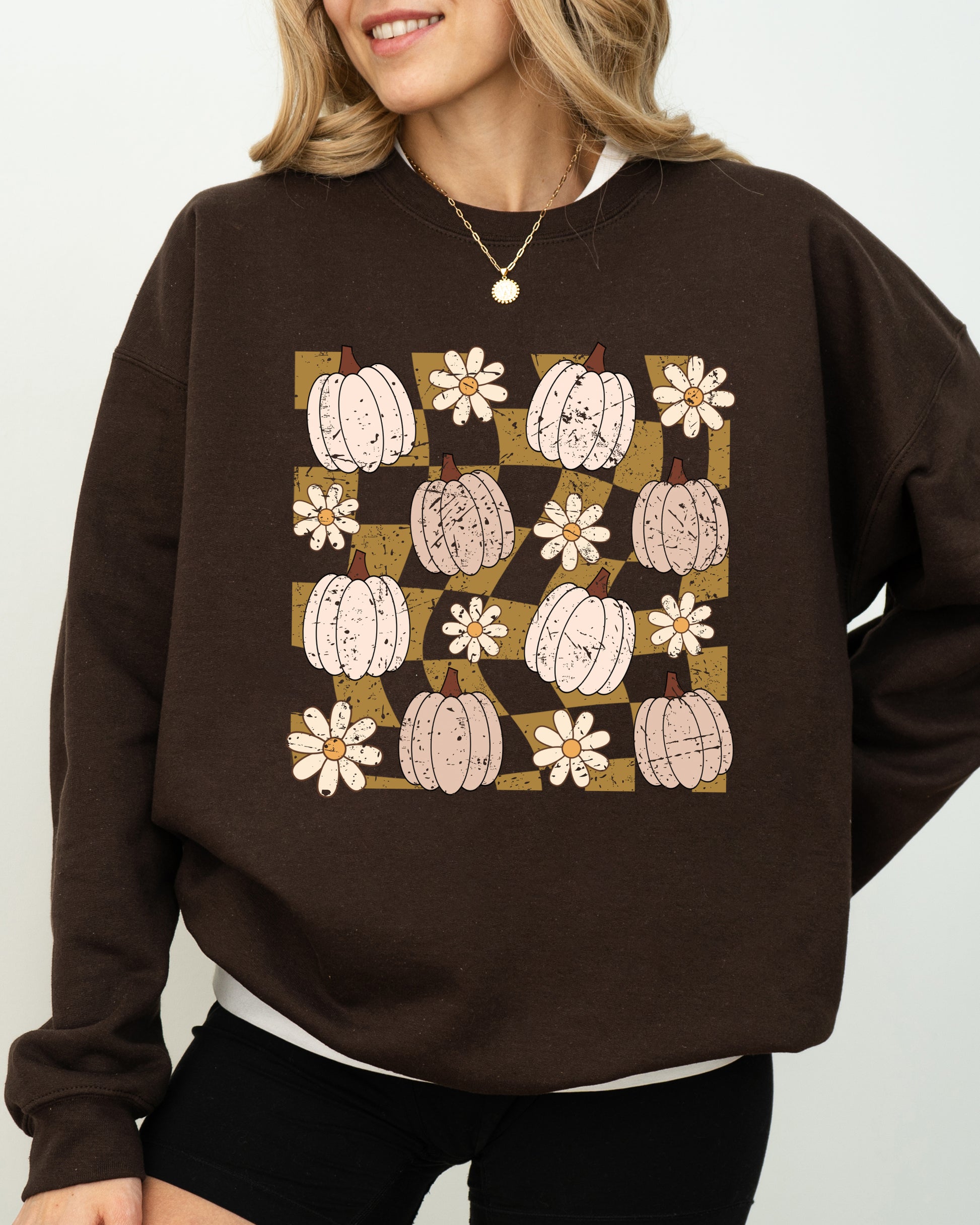 Whether you're embracing the spirit of Halloween or celebrating the beauty of autumn, our Checkered Pumpkins, Daisies, Flowers, Cute, Retro, Hippie, Positivity, Halloween, Autumn, Fall Sweatshirt is the perfect choice for those who love to express their unique style while staying comfortable.