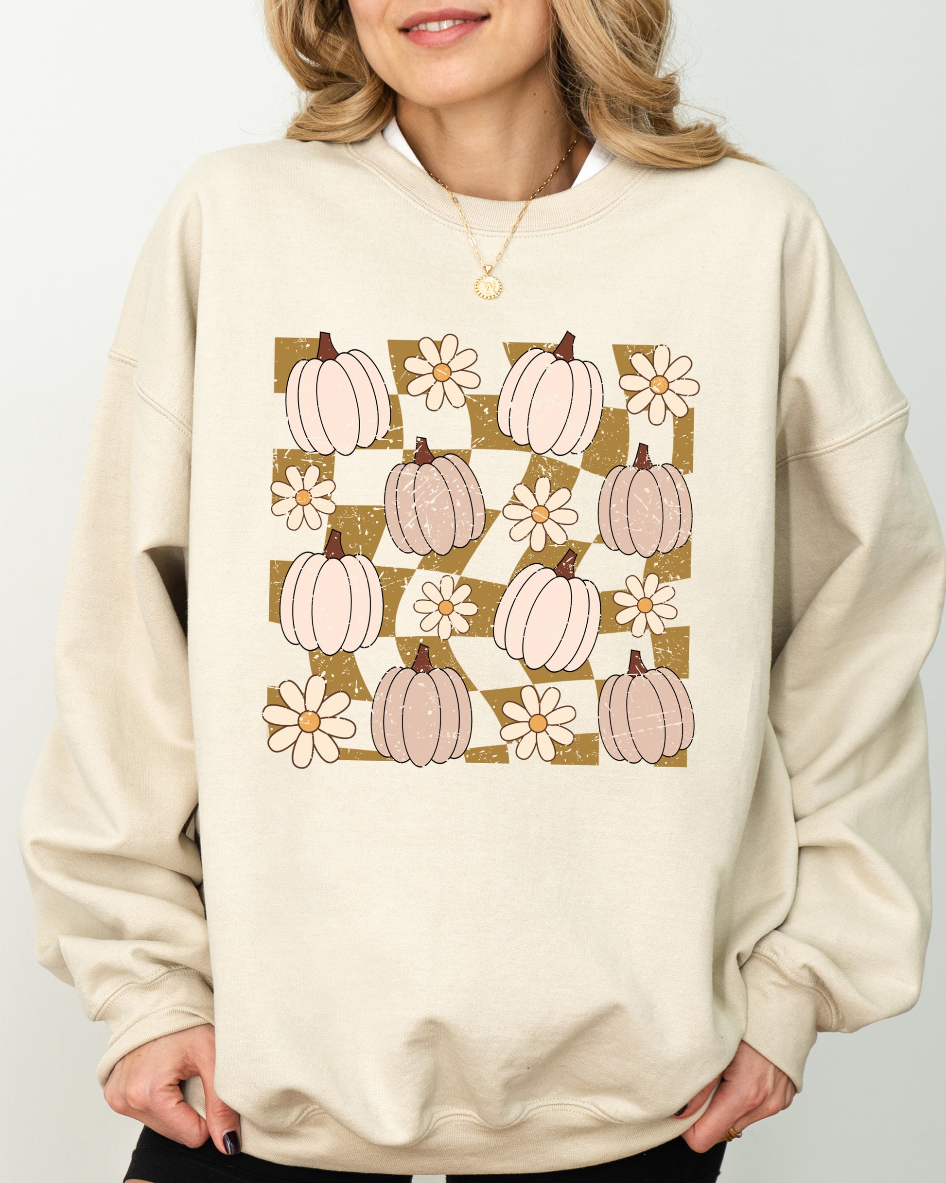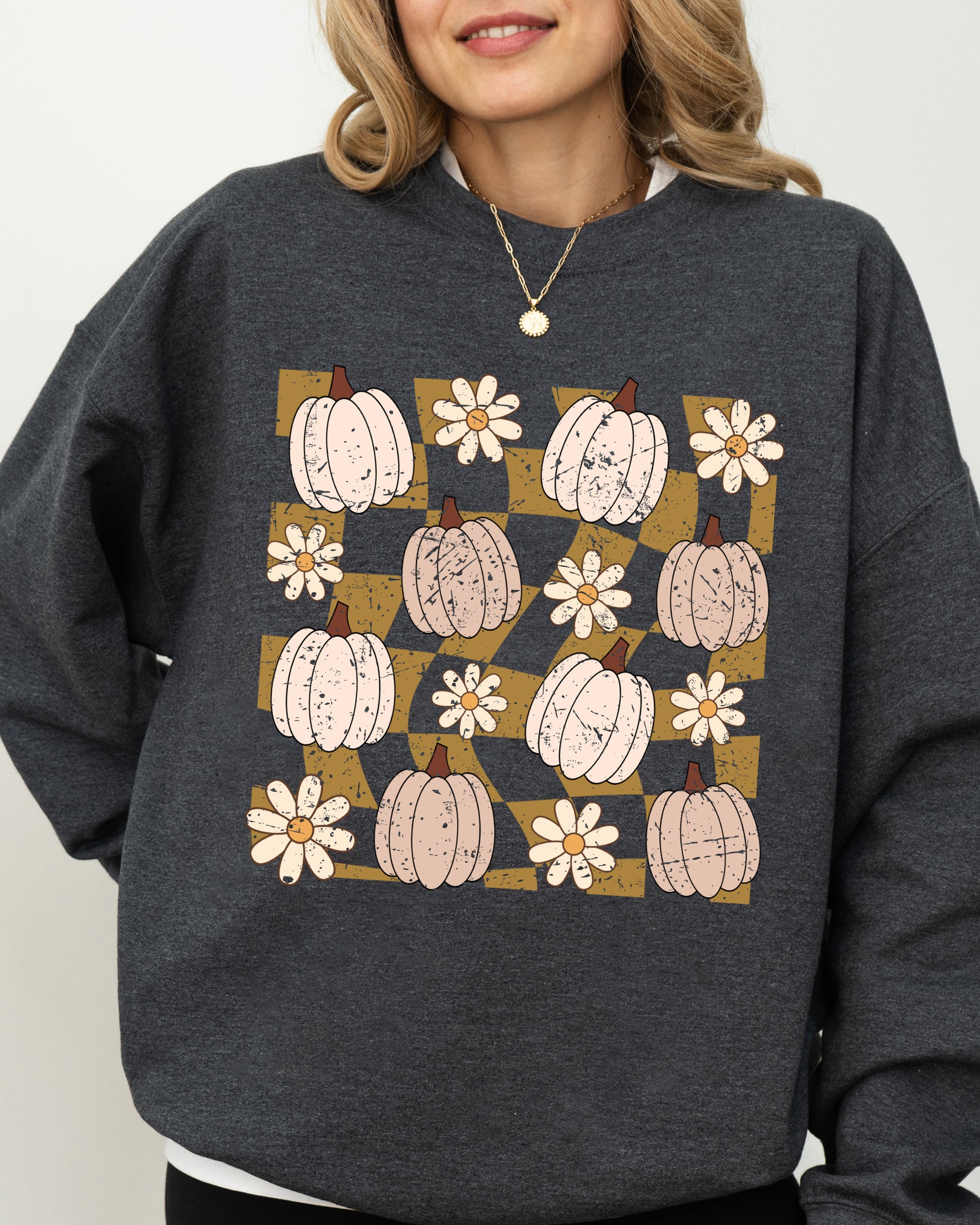 - Striking Graphic Designs: Adorned with unique, high-quality graphics like checkered pumpkins and cheerful daisies, this sweatshirt is perfect for expressing your positive, retro-inspired style.