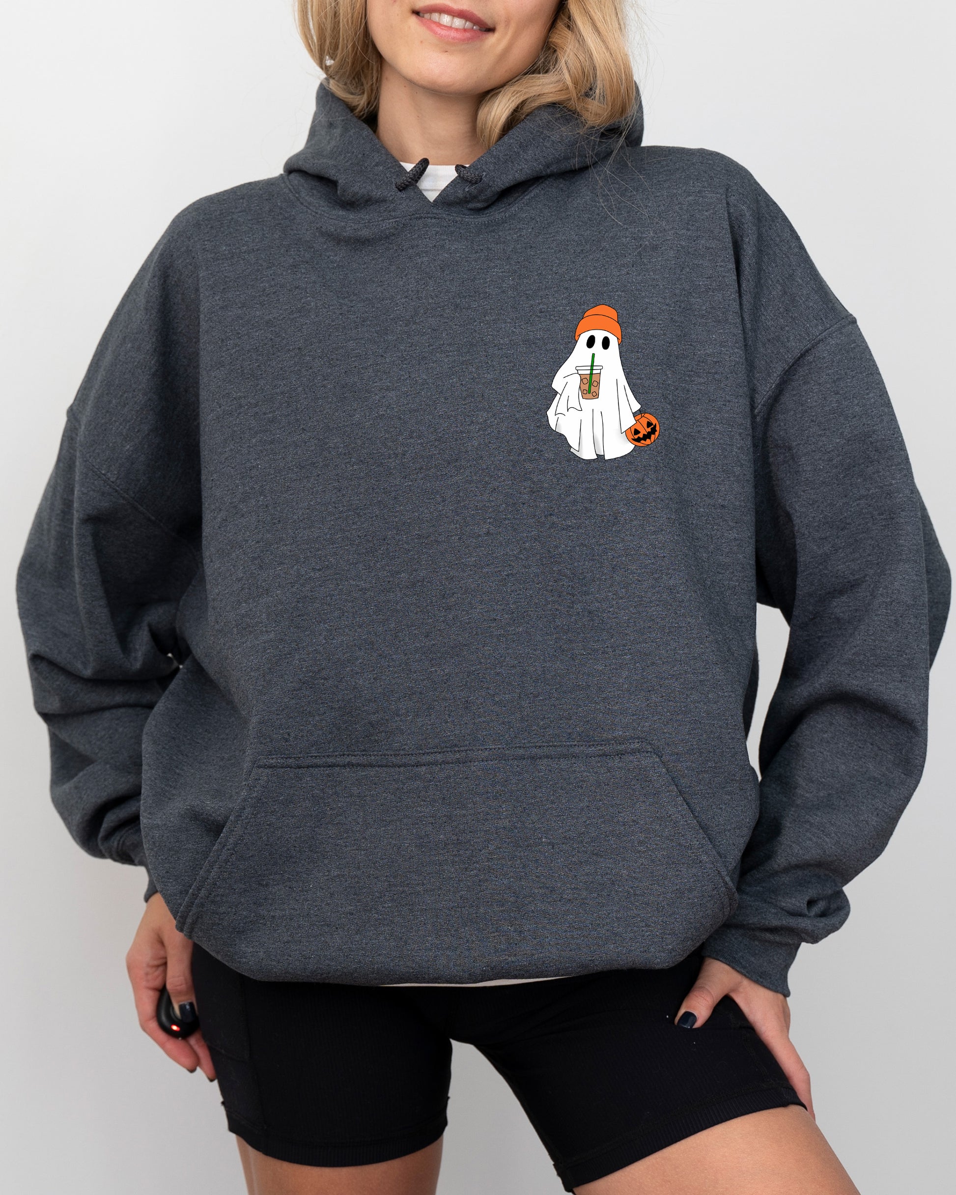 Cute Skater Ghost, Pocket Print, Halloween, Coffee, Trick or Treat Hooded Sweatshirt