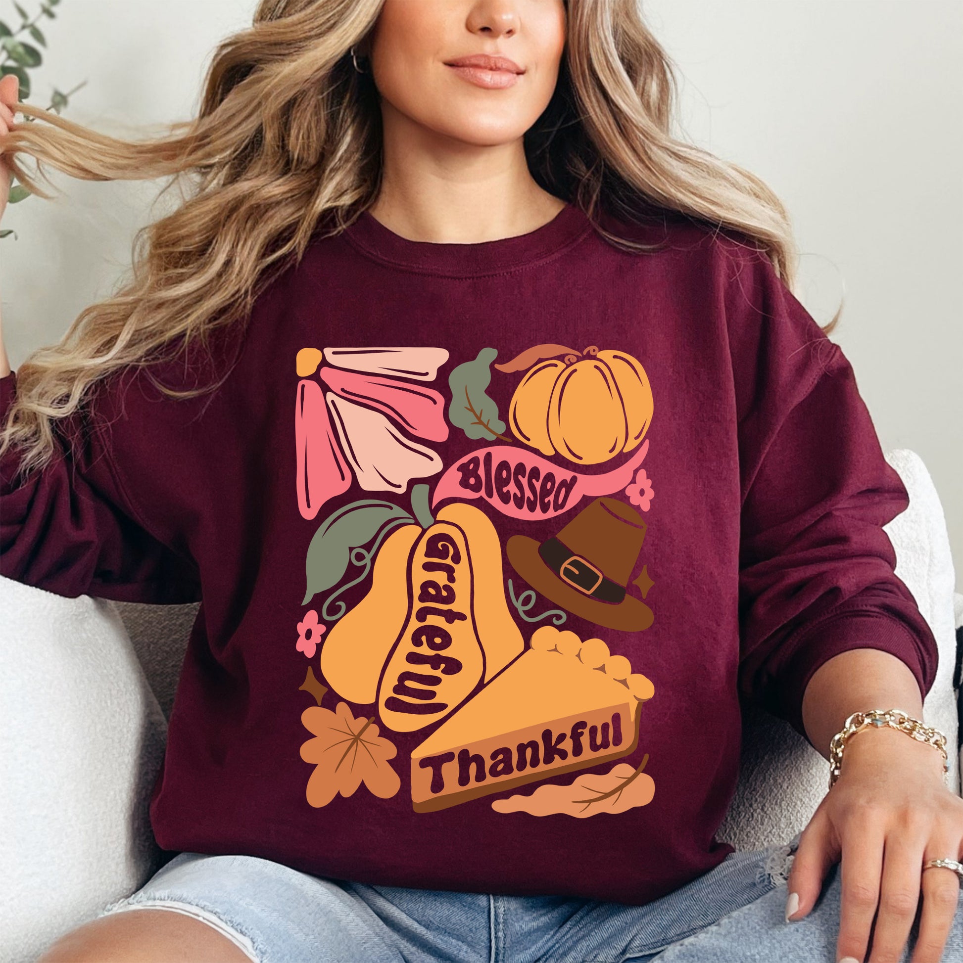 Grateful, Thankful, Blessed, Autumn, Thanksgiving, Flowers, Pumpkins, Pilgrims Sweatshirt