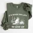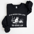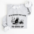 This graphic sweatshirt pairs effortlessly with jeans for a laid-back look, or can be layered over your favorite shirt for a stylish ensemble. Whether for casual outings or cozy nights in, the It's Never Too Late To Give Up, Raccoon, Funny, Aesthetic Sweatshirt is your go-to choice for comfort and fun.