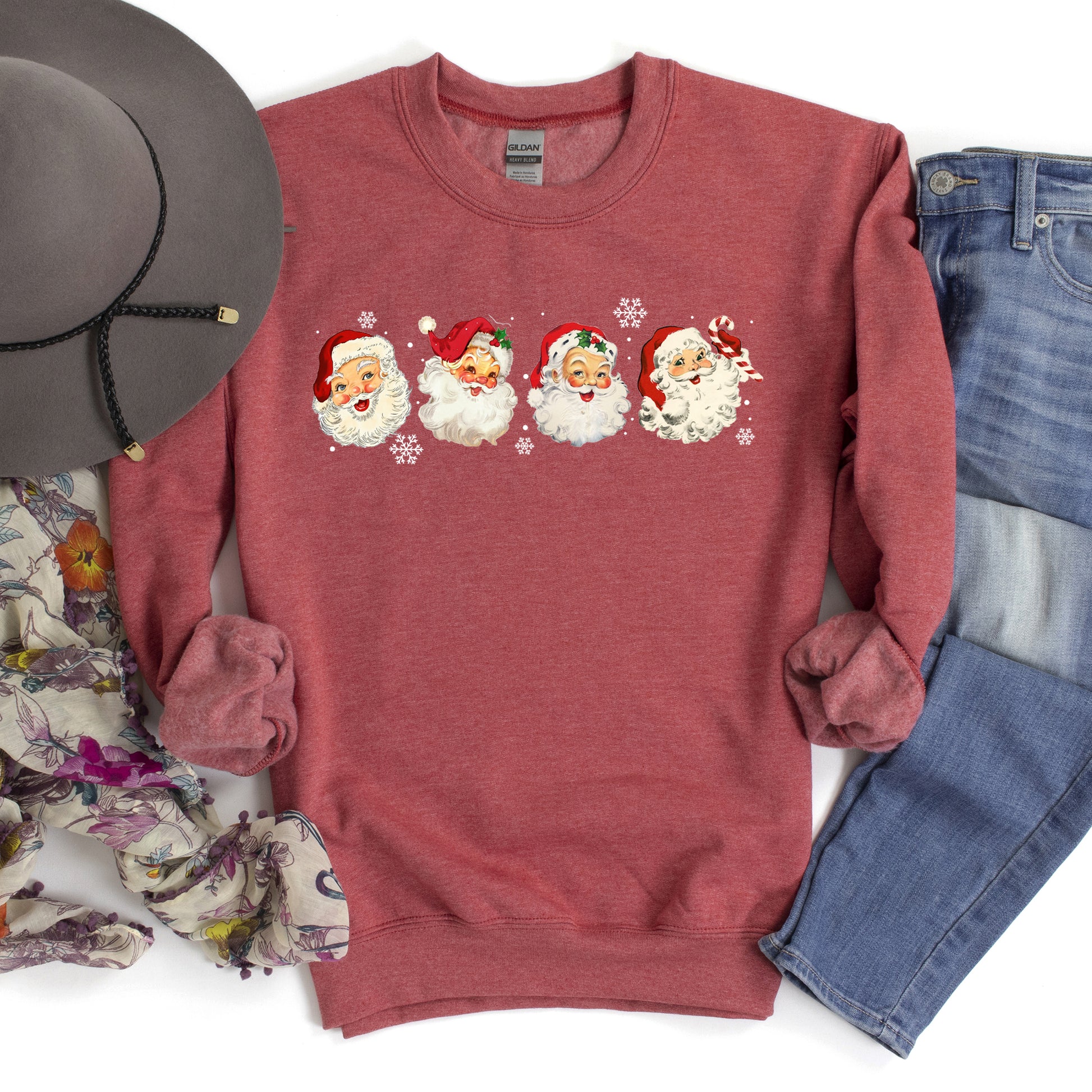 Embrace the festive spirit this holiday season with our Retro Santas With Snowflakes, Christmas Sweatshirt. This cozy sweatshirt is designed to keep you warm and stylish, making it the perfect addition to your winter wardrobe. Featuring a delightful retro Santa graphic surrounded by whimsical snowflakes, this sweatshirt is sure to turn heads during Christmas gatherings and festivities.