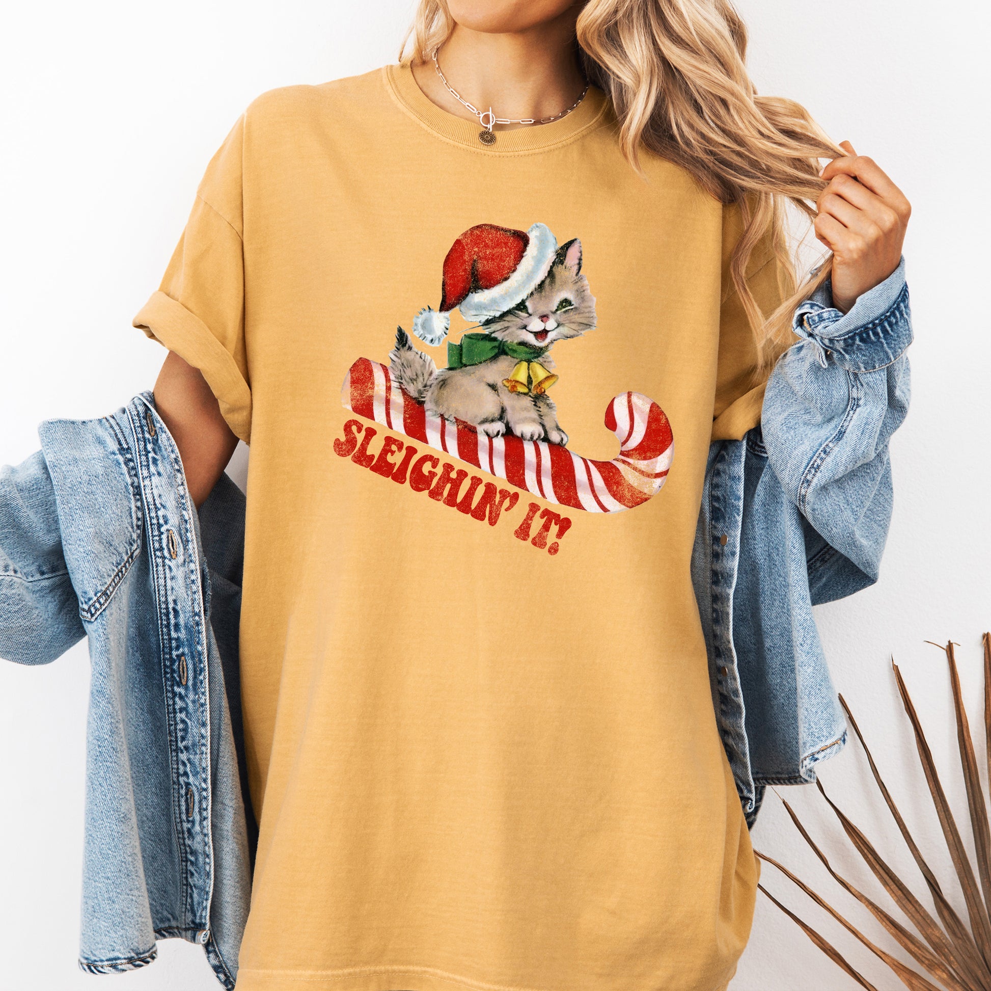 Sleighing It, Cute Kitty, Cat, Christmas, Winter, Fun, Santa, Xmas Tshirt Comfort Colors T-Shirt