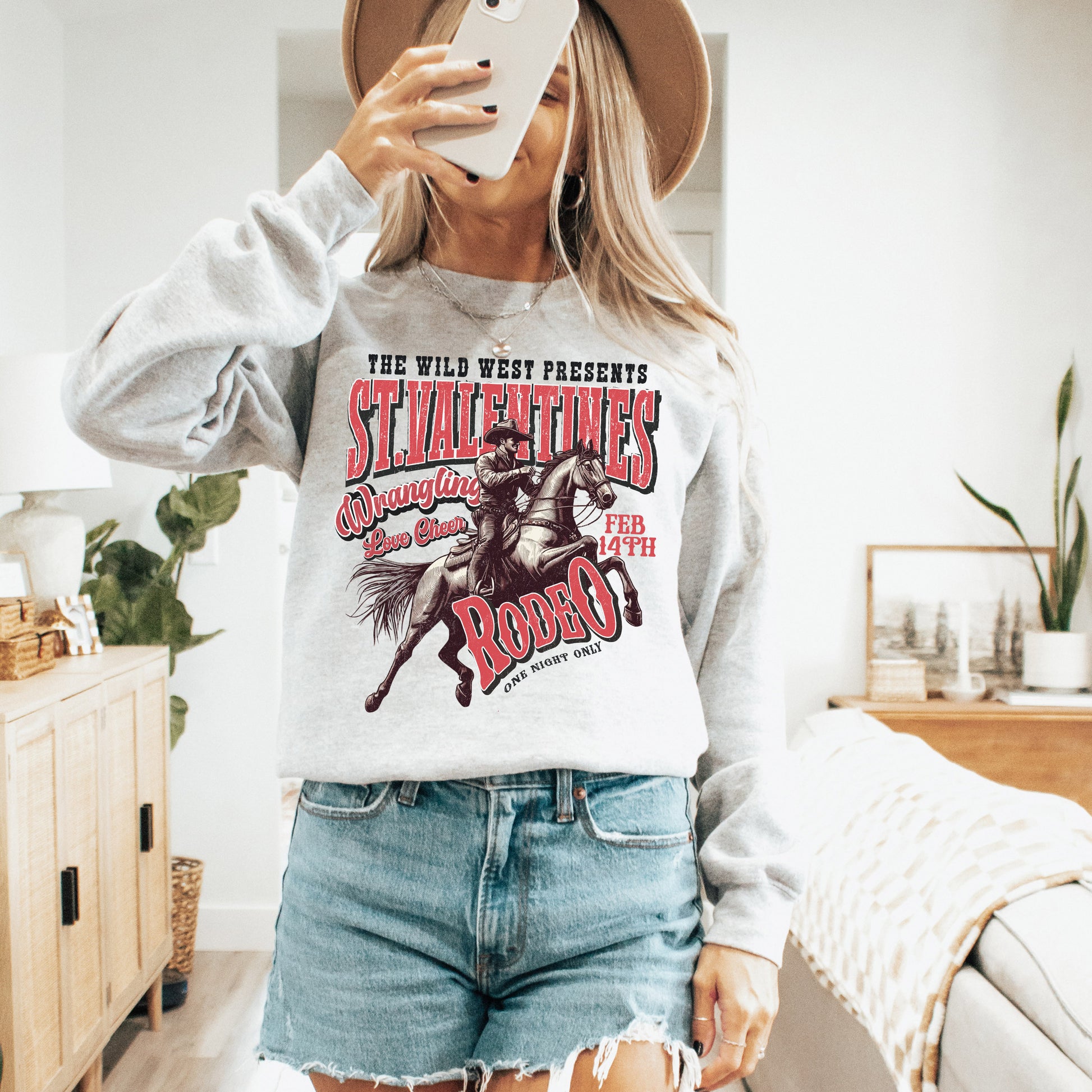 This St. Valentines Rodeo, Cowboy, Western, Wild West, Country, Valentine's Day, Love Sweatshirt pairs effortlessly with your favorite jeans for a laid-back yet fashionable look. Layer it over a casual shirt for extra flair, making it perfect for both cozy nights in and adventurous outings. Celebrate love and style this Valentine's Day with a sweatshirt that truly speaks to the heart of the country!