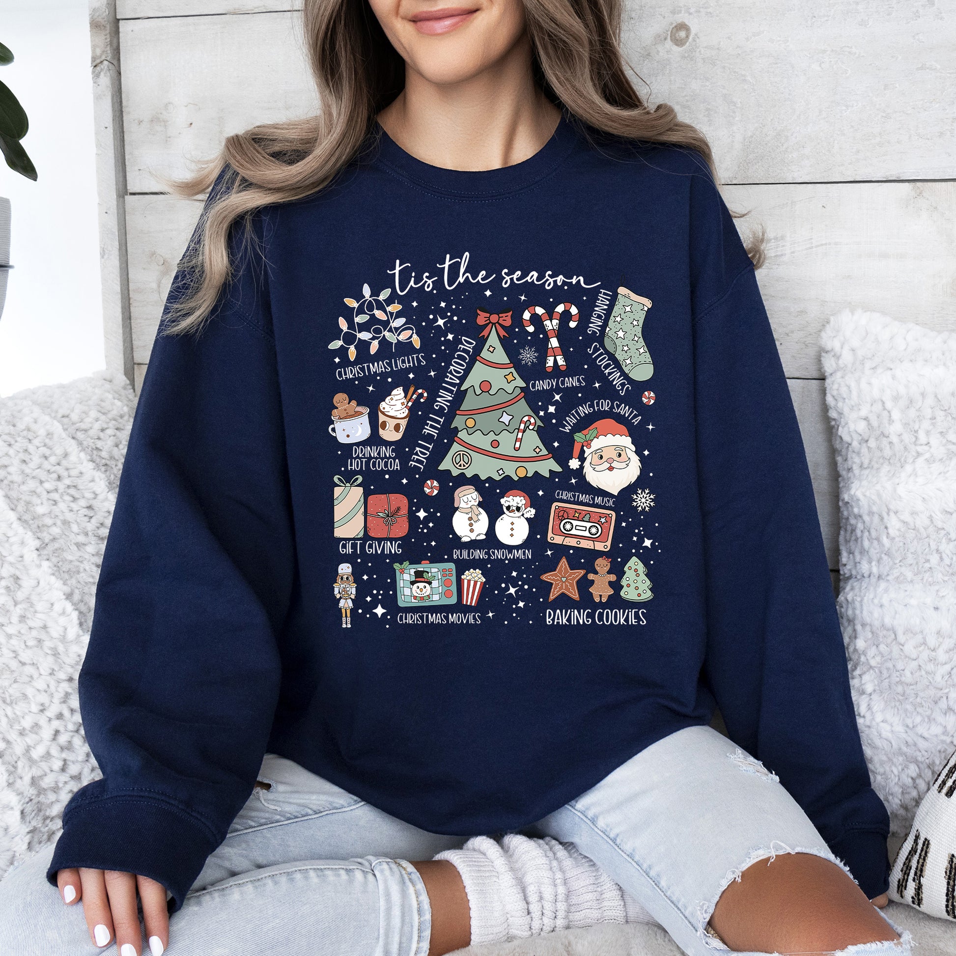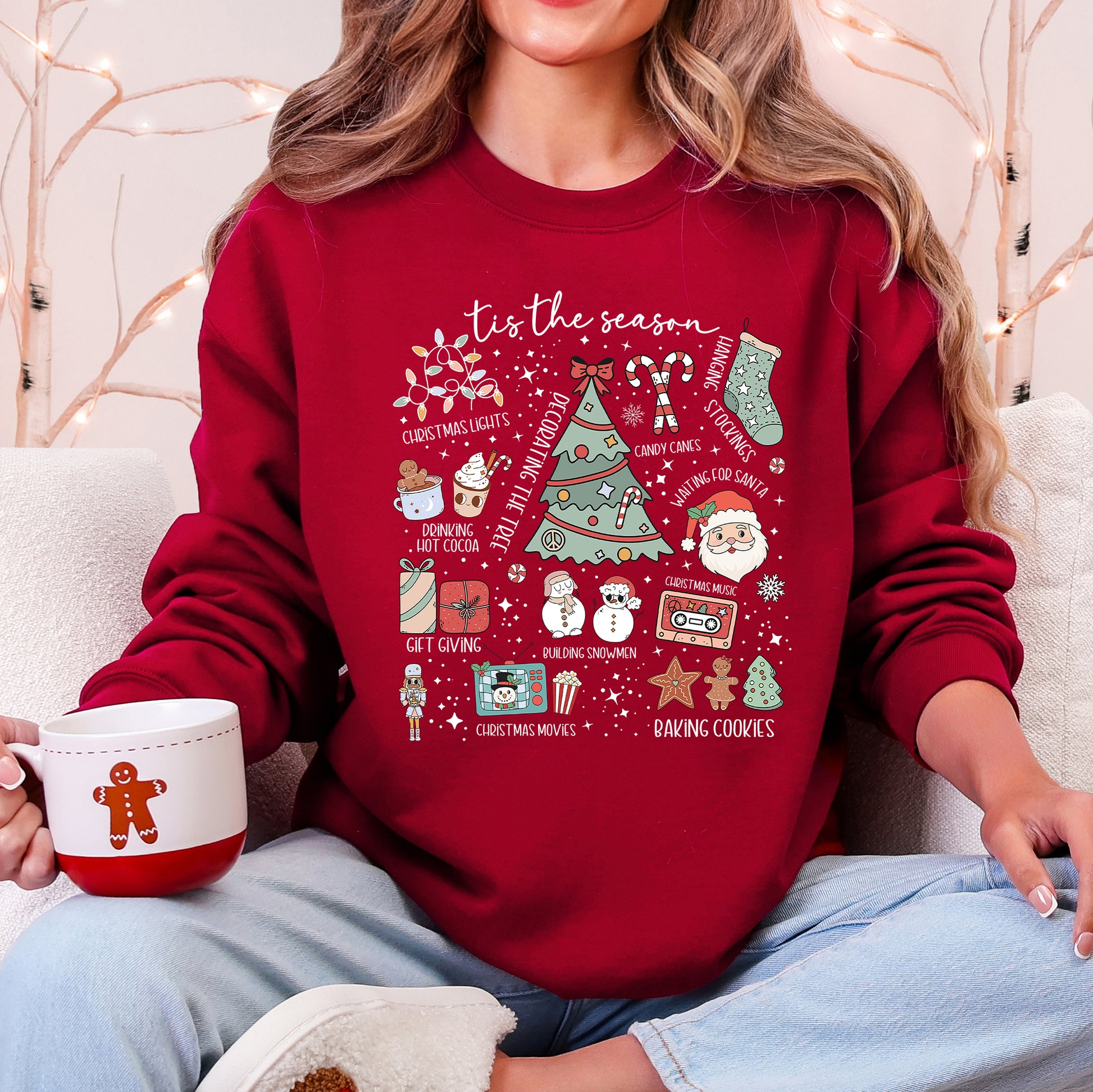 Celebrate the season in cozy, cheeky style with the Tis The Season Christmas Sweatshirt. This cute, trendy piece blends festive flair with everyday comfort, featuring Santa, a decorated tree, a jolly snowman, cookies, and gifts in a playful retro-style graphic that instantly signals holiday joy. Perfect for Christmas gatherings, family photos, or cozy nights in.