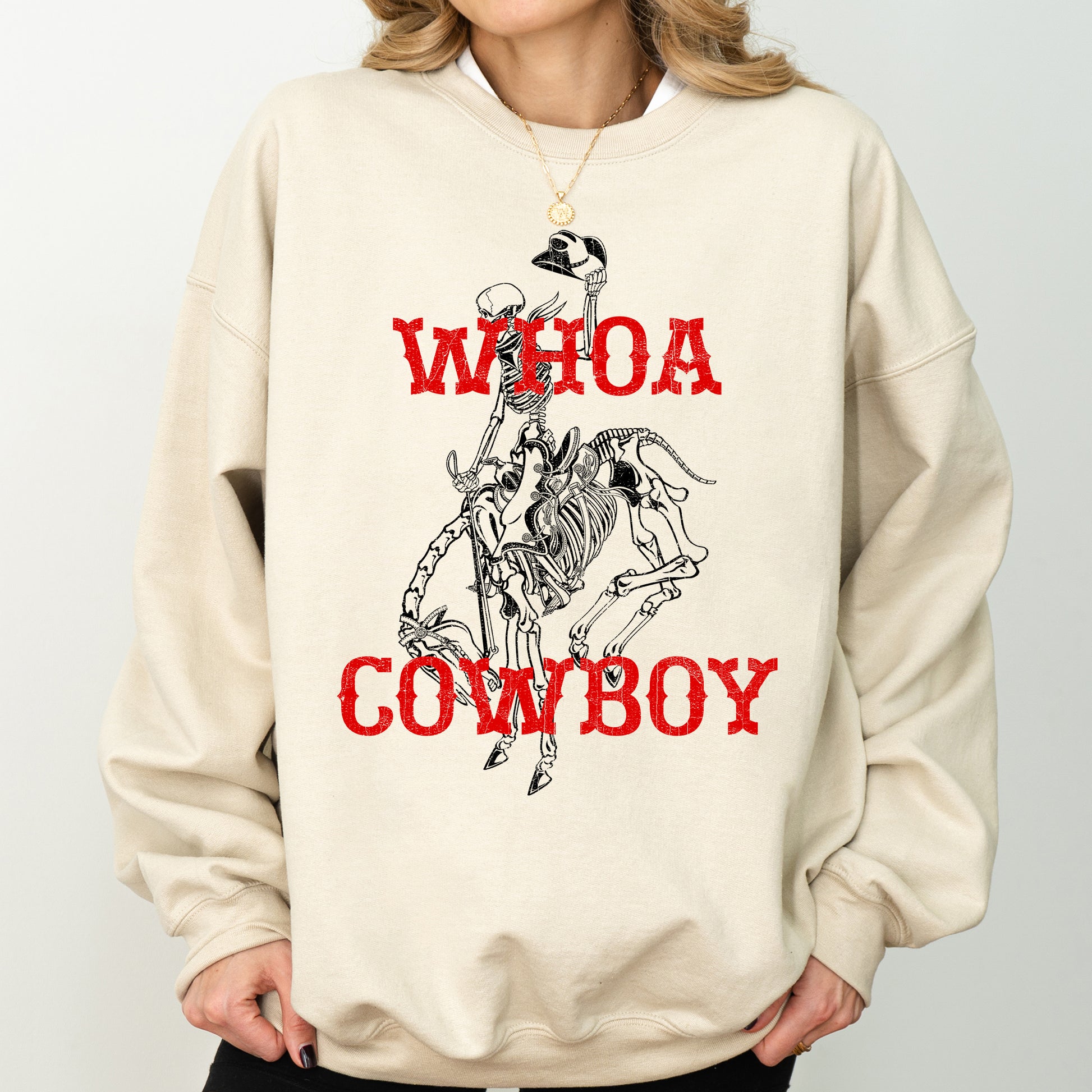 This Whoa Cowboy, Horse, Bronco Ride, Rodeo, Skeleton, Sweatshirt looks great paired with your favorite jeans for a relaxed yet trendy look. Layer it over a shirt for added style, making it ideal for casual outings, rodeo events, or cozy nights in!